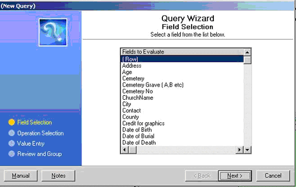 Using the querying tool, you can search the data for things like: First name, year of death etc. This is particular handy when you have a photograph and can't find the name in the database. This often happens when the wife has remarried and the last name has changed.