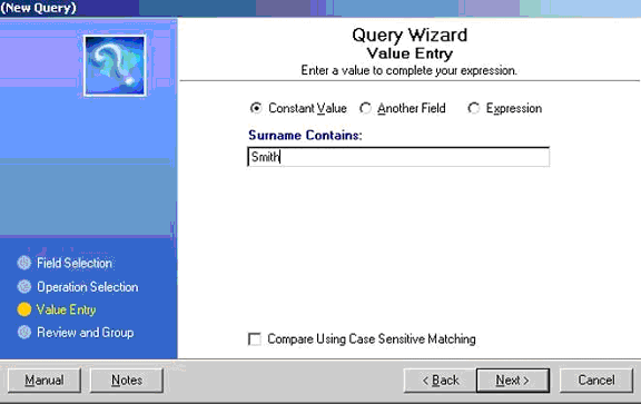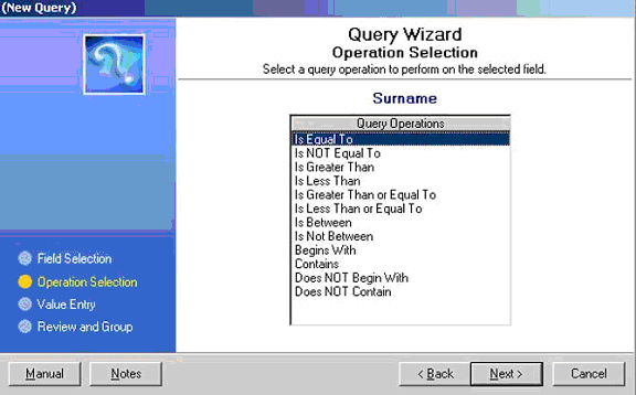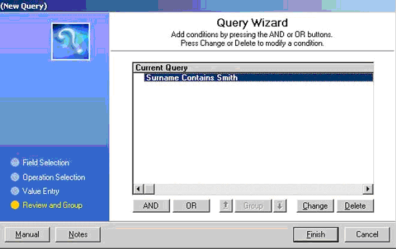 If you're finished creating your query, select Finish. You will then be asked if you want to save the query and if you do, what name should it be called. After saving the query, the program will search the data looking for any records that match your search criteria, and if found, displaying them in the list box. To clear the query, select 'Reset'.