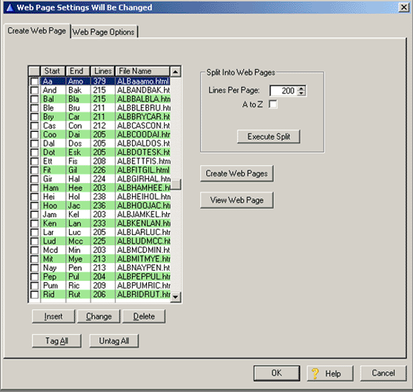 The list box shows the Start and End letters for each page, the number of lines per page and the name of the web page that will be generated.