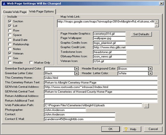 You can select what information will be contained on the web page by checking the desired check boxes. The web page will always contain the Last Name, First Name, DOB and DOD. The Header option will add to each page, the City, State, County, Township and link to your web map ( Mapquest or any other map provider ) as defined on the Cemetery update screen. If you want to include those records marked as Marker Only you must check the Marker Only box.