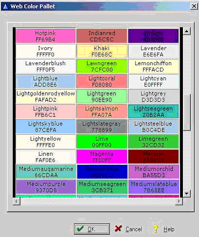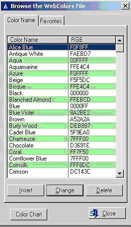 The web colors are defined using the RGB ( Red, Green, Blue ) values. This listing contains 140 pre-entered values most commonly used. You can create your own custom colors by selecting 'Insert'.