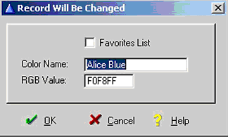 Enter a Color Name and RGB value. If you want this color to be included in your list of Favorite Colors, check the check box. Only colors that have the Favorites List checked will appear when selecting Greenbar and Header colors on the Web Options screen. After entering the above information, select OK.