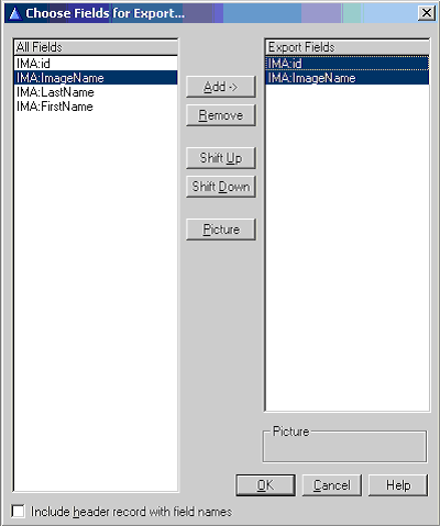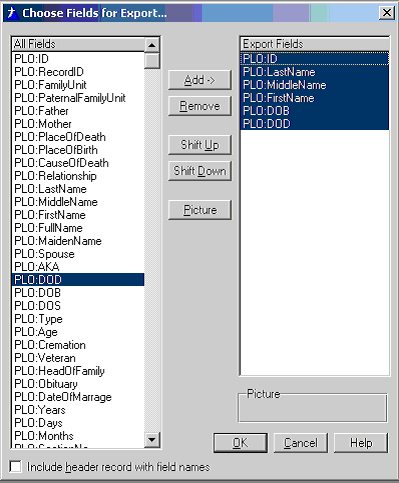 To export the Photograph data, select File/Maintenance/Export/ Tombstone Photos. A window will appear ( Fig 19) which allows you to select what fields to export. Select the field in the left list box and click on 'Add'. After selecting all fields for export, click on OK. The program will ask you the name of the file to save the data to. The file created is a Comma Separated Variable ( CSV ) file.