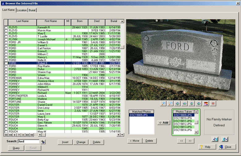 After you've entered all of the information on the interred line, press Enter to save the record. Notice the photograph from the Photos Taken list box has been automatically added to the new record ( as seen in the Matched Photos list box ) and this same file name appears in the Matched Photos list box.
